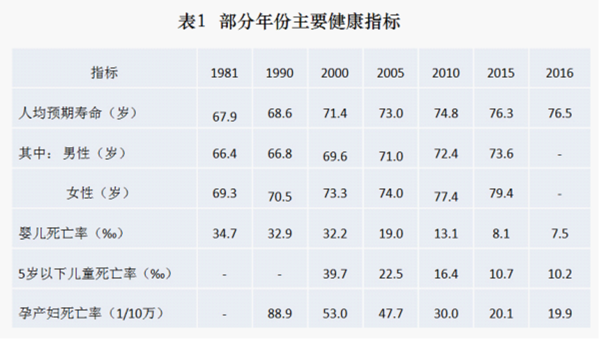 健康事业的发展给人民群众带来实实在在的健康福祉,中国人均预期寿命从1981年的67.9岁提高到2016年的76.5岁,孕产妇死亡率从1990年的88.9/10万下降到2016年的19.9/10万,婴儿死亡率从1981年的34.7‰下降到2016年的7.5‰,居民的主要健康指标总体上优于中高收入国家平均水平,提前实现联合国千年发展目标。同时,中国已形成了以宪法为总领,以民事法律法规、卫生行政法律法规、地方性法规等为实施基础,以健康领域各种纲要、纲领、计划为行动指南的健康制度体系,有效平衡医患关系,公正化解医疗纠纷,切实实现公民健康权。