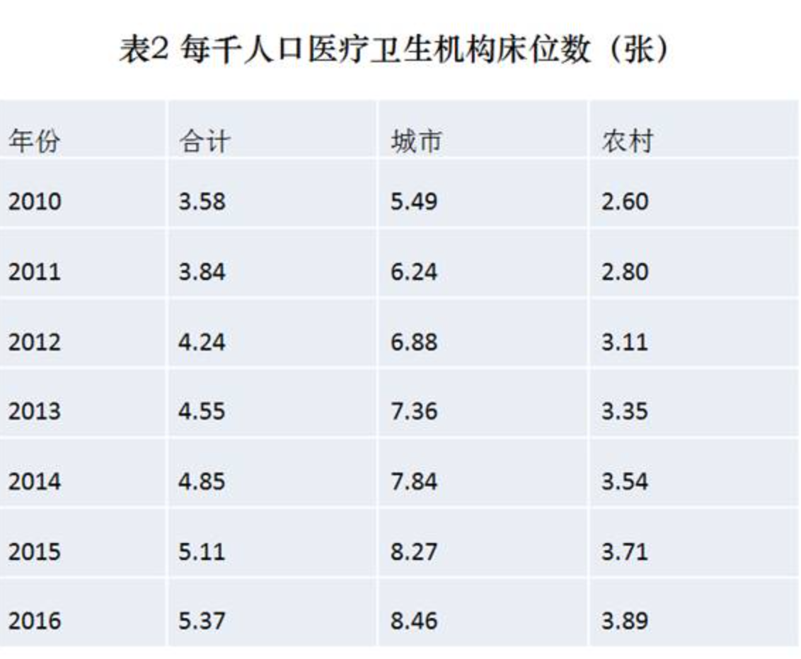 医疗卫生服务体系资源要素持续增加。2011年至2015年,国家投入420亿元,重点支持建设1500多个县级医院、1.8万个乡镇卫生院、10余万个村卫生室和社区卫生服务中心。截至2016年底,全国医疗卫生机构达983394个,其中医院29140个(公立医院12708个,民营医院16432个),乡镇卫生院36795个,社区卫生服务中心(站)34327个,疾病预防控制中心3481个,卫生监督所(中心)2986个,村卫生室638763个;全国统计的万元以上医疗设备共529.1万台,其中100万元以上的设备12.5万台。2016年,医疗机构床位数比2015年增加39.5万张,每千人口拥有床位数达到5.37张,医院床位数增加35.8万张;全国少数民族医医院有266所,床位数达26484张,年总诊疗968.7万人次,出院58.8万人次。